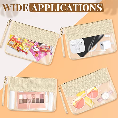 Silkfly 9 Pcs Braid Clear Straw Leather Travel Makeup Bag PU Leather Pouch with Zipper and Wristlet Clear Travel Pouch Waterproof Portable PVC Cosmetic Bag for Women, Beige 5