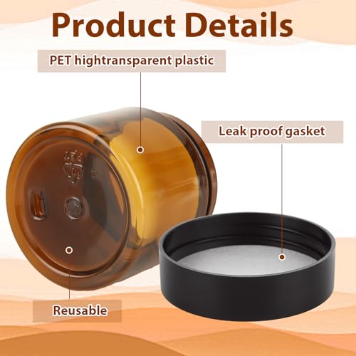 • Premium Quality: Our 2 oz amber cosmetic jars are made of high-quality PET plastic, sturdy and refillable, not easy to break, and can be washed and used many times. Plastic amber jars with lids have direct access to food, so you can store a variety of items with confidence
