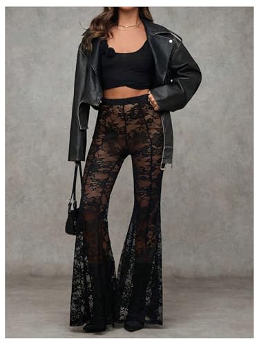 Verdusa Women's Sheer Lace High Waist Flared Leg Pants Bell Bottom Lightweight Summer Outfit 1