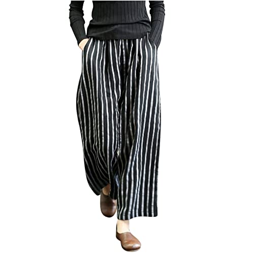 HOT ! FZYLQY Women's Casual Cotton Linen Pants Striped High-Waist Wide-Leg Slacks Lightweight Palazzo Capri Culotte Pants