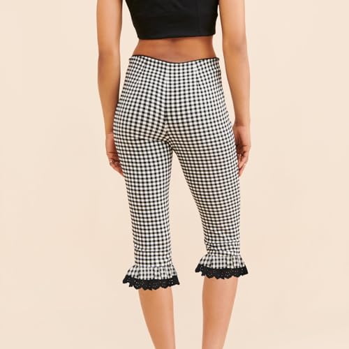 Womens Gingham Capri Pants High Waisted Skinny Fit Lace Cuffs Plaid Short Pants Summer Capris Leggings 6