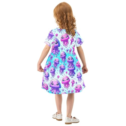 CHIFIGNO Cute Cartoon Jellyfishes Teal Girls Dress Short Sleeve Casual Summer Dress Crewneck Summer Clothes for Girls 5