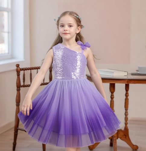 LQSZ Girls Sequin Dress Tutu One Shoulder Summer Dresses Fancy Party Prom Gowns Tulle Sundress for 3-12 Years Purple 5