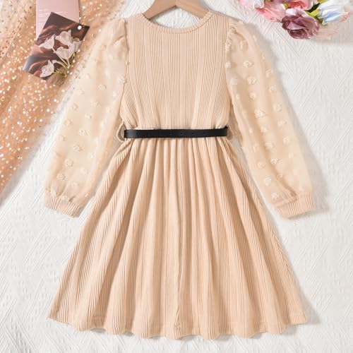 Little Girls Fall Winter Puff Long Sleeve Swiss Dot Dresses A-Line Knit Dress with Belt for Kids Size 4-12 6