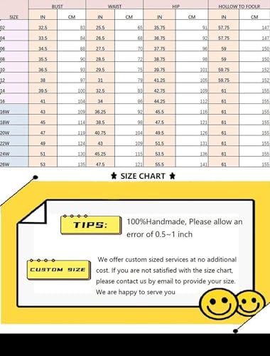 • SIZE DETAILS:Please refer to our size chart in the product image section on the left. PLEASE NOT AMAZON SIZE CHART. We accept free customization service, if you want to customize the dress, Please provide us your measurements of the Bust, Waist, Hips and Hollow to Floor when you place the order. The dress will be made fit you perfect, please contact with us by email within 12 hours after you place order.