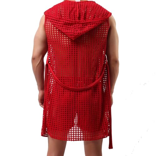 Mens Sexy Hooded Sleeveless Robes Bathrobes Mesh See Through Lingerie Sleepwear Fishnet Robe Pajamas with Belt 5