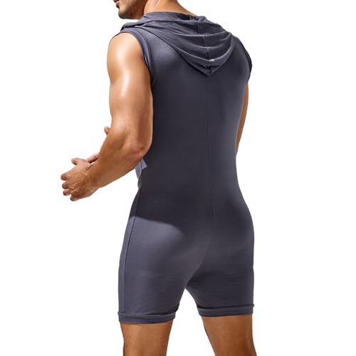 Men's Sexy Hoodie Jumpsuit,Party Sleeveless Sport Button-Down Short Slim Fit Elasticity Sleepwear XXL Black Grey 1