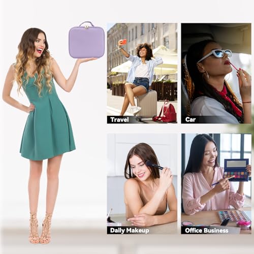 HOT ! Travel Makeup Bag with LED Mirror and 10x magnifying glass with 3 Lighted Settings, Adjustable Dividers and Makeup Brush Storage Bag Purple