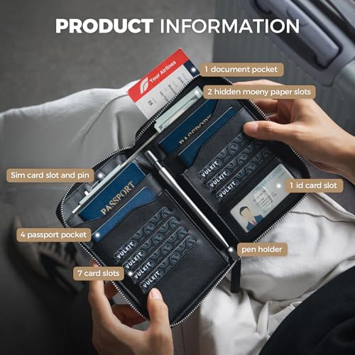 HOT ! VULKIT Leather Passport Holder for 4-8 Passports Family Passport Wallet with Zipper Travel Documents Organizer for Men or Women(Black)