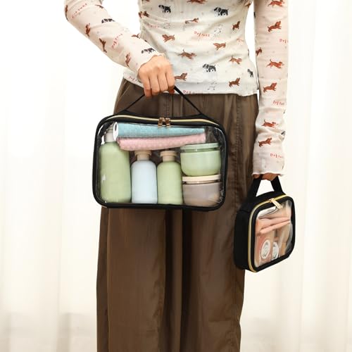 • Portable Size: You will get 6 toiletry bags, including 4 medium and 2 large. The medium transparent toiletry bag measures 7.8 x 2.4 x 5.9 inches, which complies with the airline's 3-1-1 liquid rule and can be quickly passed through airport security. Note: The large toiletry bag measures 10.8 x 3.6 x 7.6 inches, with a capacity of more than a quart, which does not comply with regulations