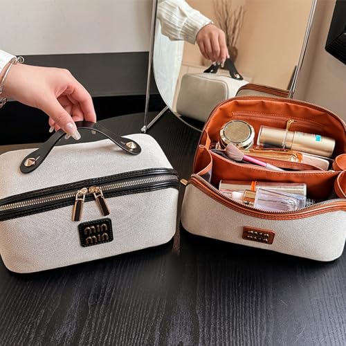 HOT ! Large Capacity Cosmetic Bag, Travel Makeup Bag for Women Portable Open Flat Toiletry Bag Make up Organizer with Divider and Handle, Brown.