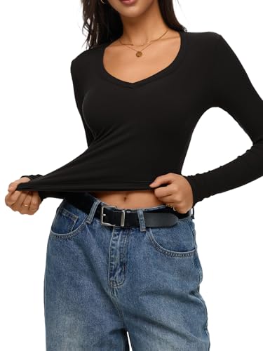REORIA Womens Long Sleeve Shirts 2025 Fall Trendy Deep V Neck Slim Fit Basic Tops Casual Going Out Top Tee Blouse 2