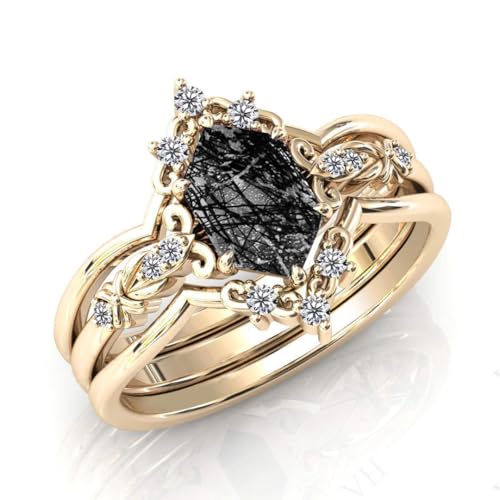 Natural Hexagon Black Rutilated Quartz Engagement Ring Set 925 Sterling Silver Rings for Her with Free Engraving Jewelry Gift for Women Black Rutilated Quartz Vintage Ring Set Size 4-15 -7 2