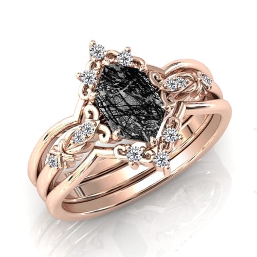Natural Hexagon Black Rutilated Quartz Engagement Ring Set 925 Sterling Silver Rings for Her with Free Engraving Jewelry Gift for Women Black Rutilated Quartz Vintage Ring Set Size 4-15 -7 3