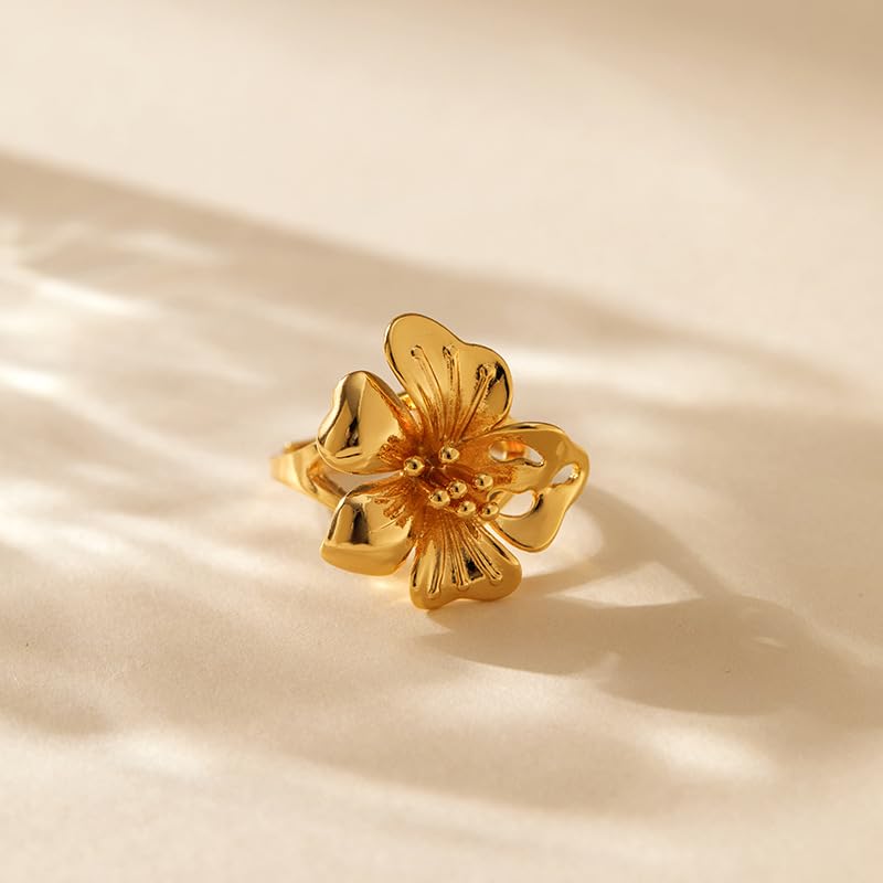Vintage Gold Flower Ring for Women Adjustable Statement Trendy Floral Finger Rings Elegant Wedding Promise Band Stackable Comfort Fit Summer Beach Bohemian Holiday Chic Jewelry for Her 4