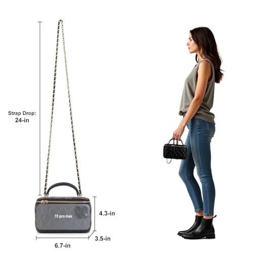• 【Small Size Big Space】It's lightweight and 17x11x8.5cm (6.7x4.3x3.5in) in size. But its boxy shape and wide-opening top zipper closure allow it to hold a surprising amount. It’s spacious enough to fit an iPhone15 Pro Max or Android phone with a 6.7-inch screen, and daily essentials such as makeup, skincare, tissues, sunglasses, and a wallet. With 3 internal card slots and 1 lipstick holder, it can function as a boxy cosmetic bag, vanity case, makeup handbag.
