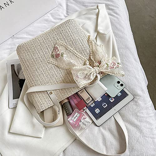 Women Large Straw Beach Tote Bag Summer Hand-woven Bags Shoulder Bag Leather Handle Beach Handbags with Cute Lace Bow Small (White) 1