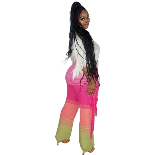 Womens Fashion High Waist Knitted Crochet Hollow Hit Color Tassel Pants Trousers Pink 1