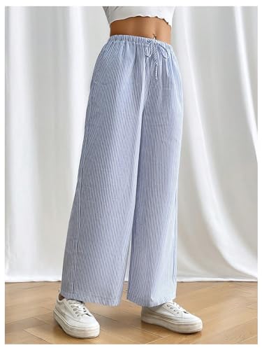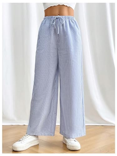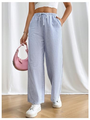HOT ! Floerns Women's Striped Elastic Drawstring Waist Straight Wide Leg Pants with Pockets