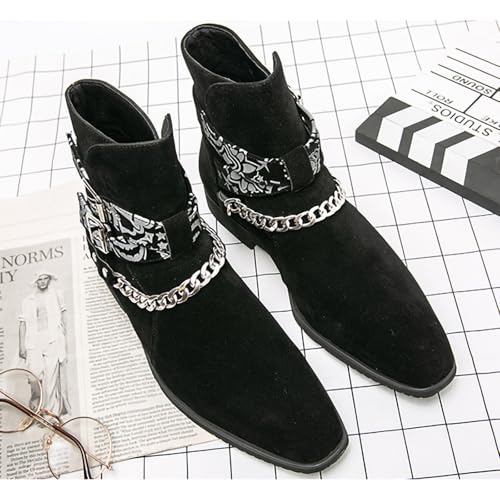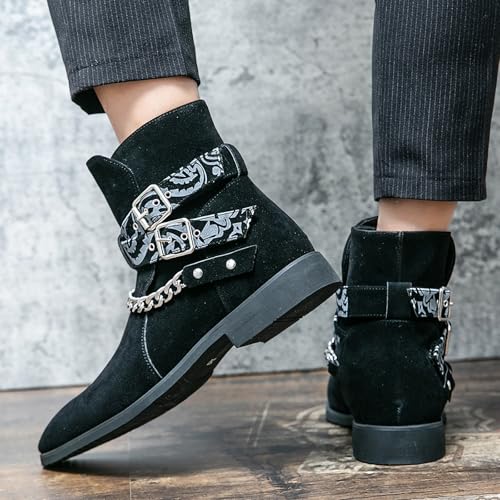 Men's Square Toe Chelsea Boots Dress Ankle Boots Casual Suede Buckle Boots Stylish Personality Chain Leather Shoes 6