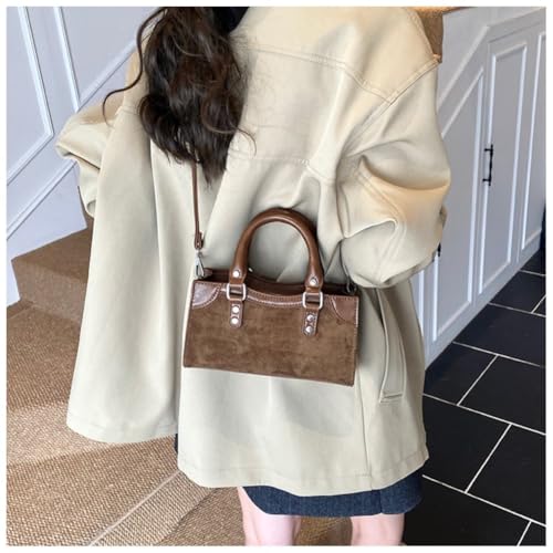 HOT ! Chic Suede Top Handle Handbag for Women, Mini Soft Leather Shoulder Crossbody Bag, Vintage Style Hobo Riveted Satchel Purse