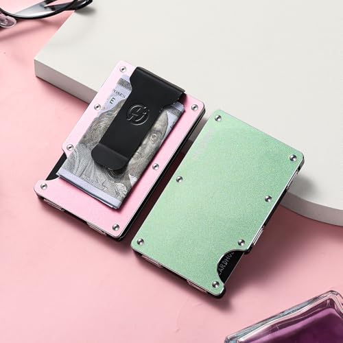 HOT ! Minimalist for Women, Slim Card Holder with Removable Clip, RFID Blocking Aluminum Wallet, Compact Front Pocket Metal Wallet – Pink