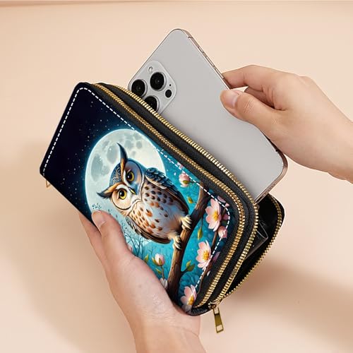 Owl Under The Moon Print Women's Large Capacity Wallet PU Leather Double Zipper Clutch Purse for Cash/Card/Coin/Smart Phone 6