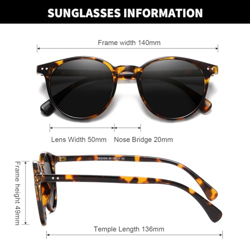 • Package Contents and Dimensions: Classic Polarized Sunglasses*3, Eyewear Pouch*3, Eyewear Cloth*3, Packing Box*1 :The sunglasses dimension is:lens width: 50mm(1.96inches).lens height: 49mm(1.92inches) .temple length: 136mm(5.35inches) and nose bridge: 20mm(0.78inches).