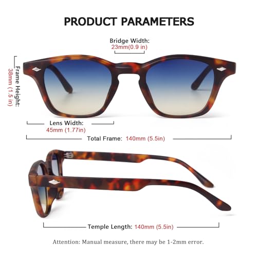 • MENS RETRO SUNGLASSES DIMENSION: Tortoise shell sunglasses lens width: 45 mm (1.77 inches), lens height: 38 mm (1.5 inches), temple length: 140 mm (5.5 inches) and nose bridge: 23 mm(0.9 inches). The package blue sunglasses for women*1, microfiber pouch*1 (Can be used for Cleaning Cloth )