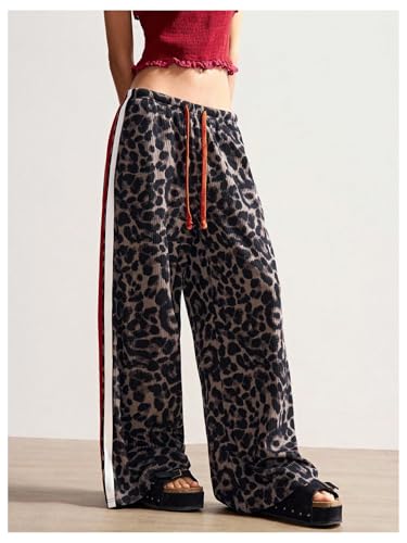 HOT ! Women's Y2K Cheetah Baggy Pants Leopard Wide Leg Pants Striped Knitted Vintage Elastic Waist Trouser with Pocket