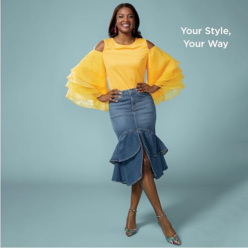 • Favorite Skirt: Mid-weight stretch denim with 4-pocket styling, zip fly with button closure, and two-tier ruffle trim at hem.