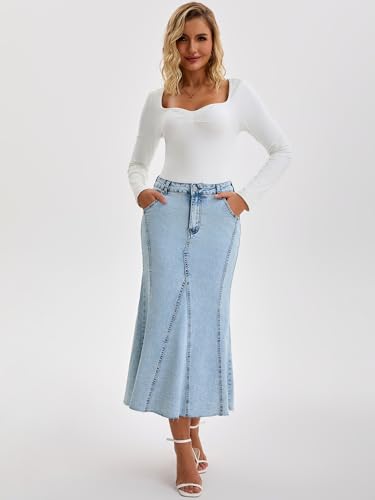 Womens Fishtail Long Jean Skirt High Waisted Casual Stretchy Fit and Flare Midi Denim Skirts 6