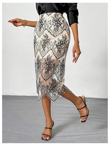 More information about Floerns Women's Elegant Lace Overlay Asymmetrical Hem High Waist Pencil Midi Skirt