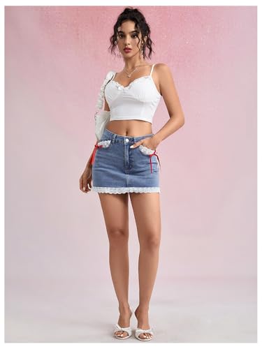 Floerns Women's Contrast Lace Bodycon Denim Skirt Cute Bow Party Mini Jean Skirts 5