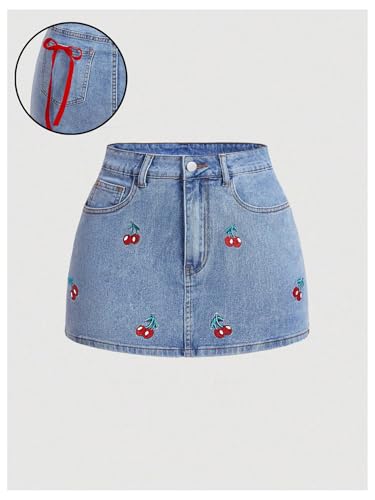 WDIRARA Women's Cherry Embroidered Bow Knot Bodycon Denim Skirt Y2k Stretch Mini Jean Skirts 6