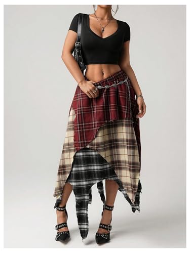 • Features: Patchwork skirt, elastic waist, asymmetric hem, plaid, low rise, color block, ruffle hem, y2k hankerchief skirts