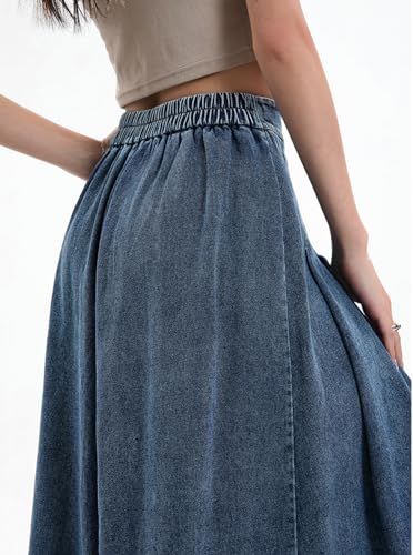 CHARTOU Women Pleated Denim Skirt Long Jean Skirt Flowy Elastic Waist Denim Maxi Ruffle Skirt Flare A Line Skirt 5