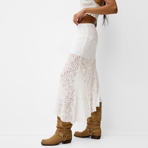 • High waisted skirts for women, summer midi skirts with lace patchwork design,irregular hem, pencil bodycon styles, sexy and elegant dress up skirts
