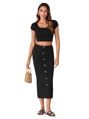 • Slim fit, below knee length. Women plain high waist fall skirt feature with button decor, stretchy knit fabric and split back design, can better show off your charming collarbone.