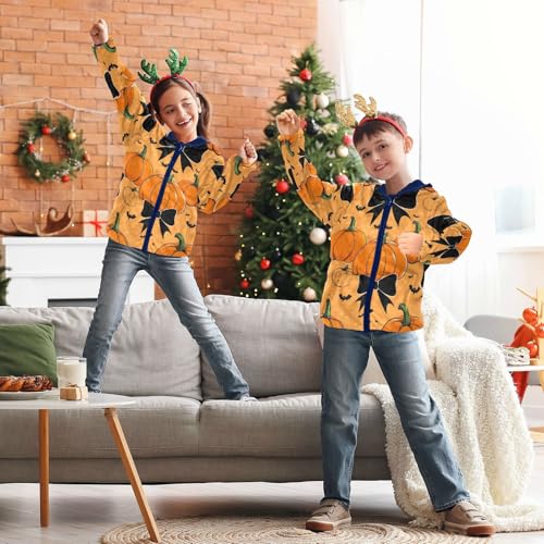 Pumpkin Bats Bow Orange Toddler Fleece Jacket Girl Boys Hooded Fleece Jacket Coat Warm Outwear Zip-up 3-10T 3