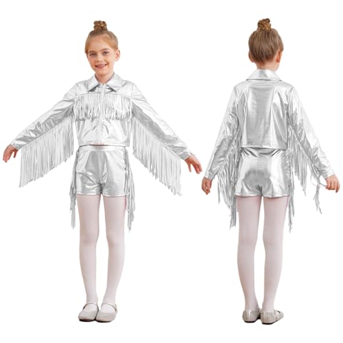 Aislor Kids Girls Tassel Shiny Metallic Long Sleeve Jacket Coat Crop Sweatshirt Tops Outwear with Fringe Shorts Set 5