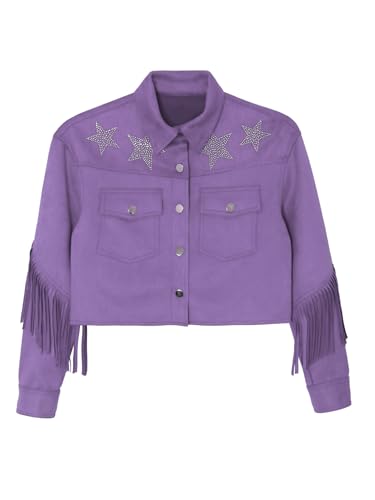 Linjinx Kids Girls Faux Suede Tassel Jacket Long Sleeve Star Rhinestone Color Block Button Up Coat Fringe Outwear 7