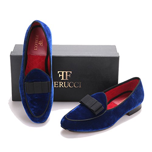 HOT ! FERUCCI Handmade Blue Men Velvet Slippers Loafers with Black Bow