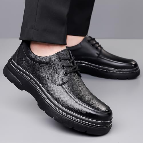 Men's Genuine Leather Platform Chunky Heel Oxfords Comfort Round Toe Lace Up Anti-Slip Lug Sole Business Formal Dress Shoes Classic Handmade Fur Lining Office Work Shoes 6