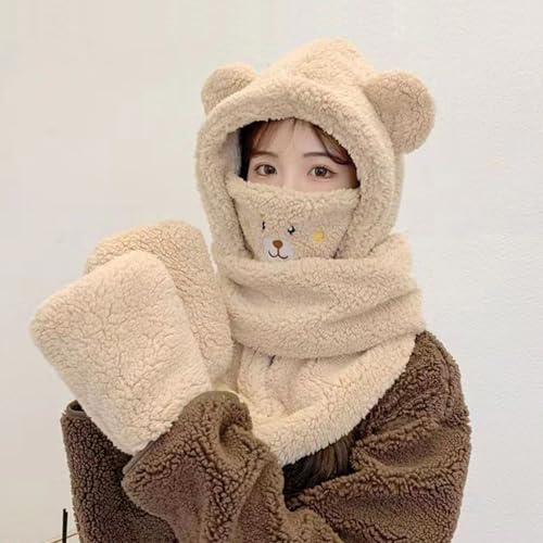 Muloo Cute Fleece Bear Ear 4in1 Scarf Hat Mitten Mask Suit Soft Winter Hat Thicken Warmer Supplies for Women Teens Winter, Beige 4