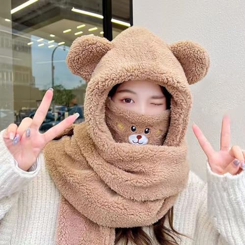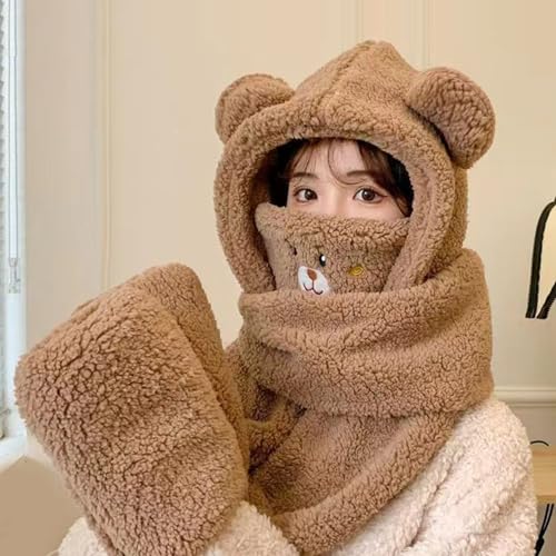Muloo Cute Fleece Bear Ear 4in1 Scarf Hat Mitten Mask Suit Soft Winter Hat Thicken Warmer Supplies for Women Teens Winter, Beige 1
