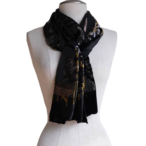 HOT ! Silk Base Burn-out Velvet Shawl, 72" L x 21" W, Reed Catkin, Black Gold