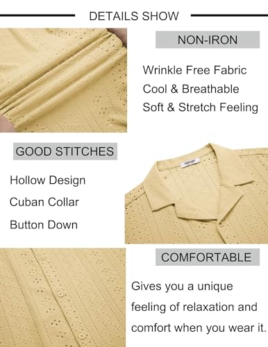 • Expertly Tailored: Exceptional fabrics and expertly tailored fits are important touches of this beach shirt. Hollow out geometric design, pattern eyelet embroidery, cuban collar, short sleeve, button down closure make these shirts cool and casual