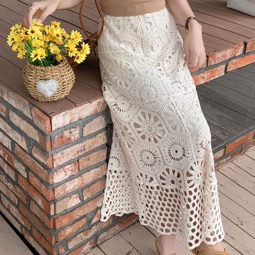 More information about Women Vintage Hollow Out Crochet Knit Flower A Line Skirt Elastic High Waist Embroidery Beach Vacation Long Skirt