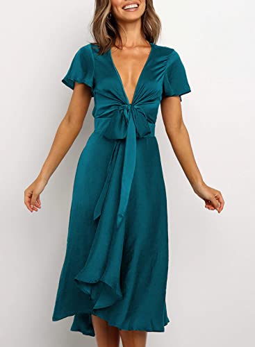 HOT ! miduo Womens Satin V Neck Ruffle Short Sleeve Tie Front High Waist Midi A-Line Maxi Dresses
